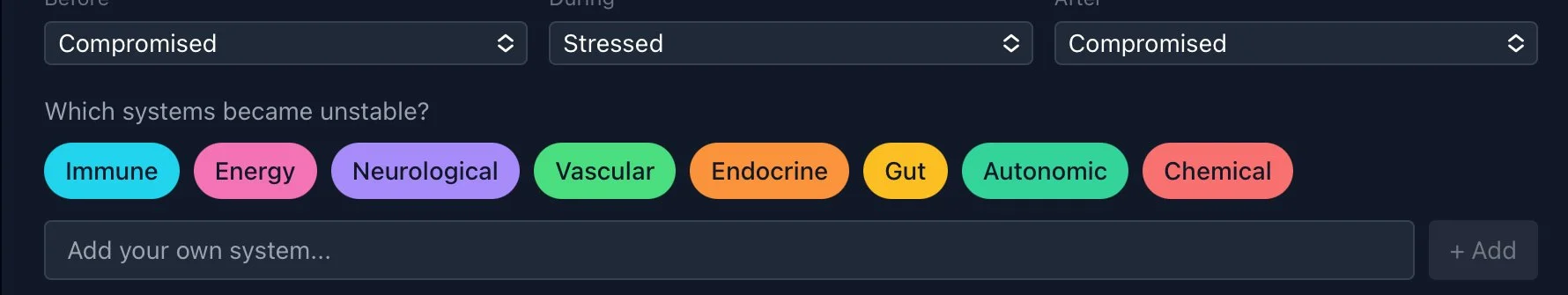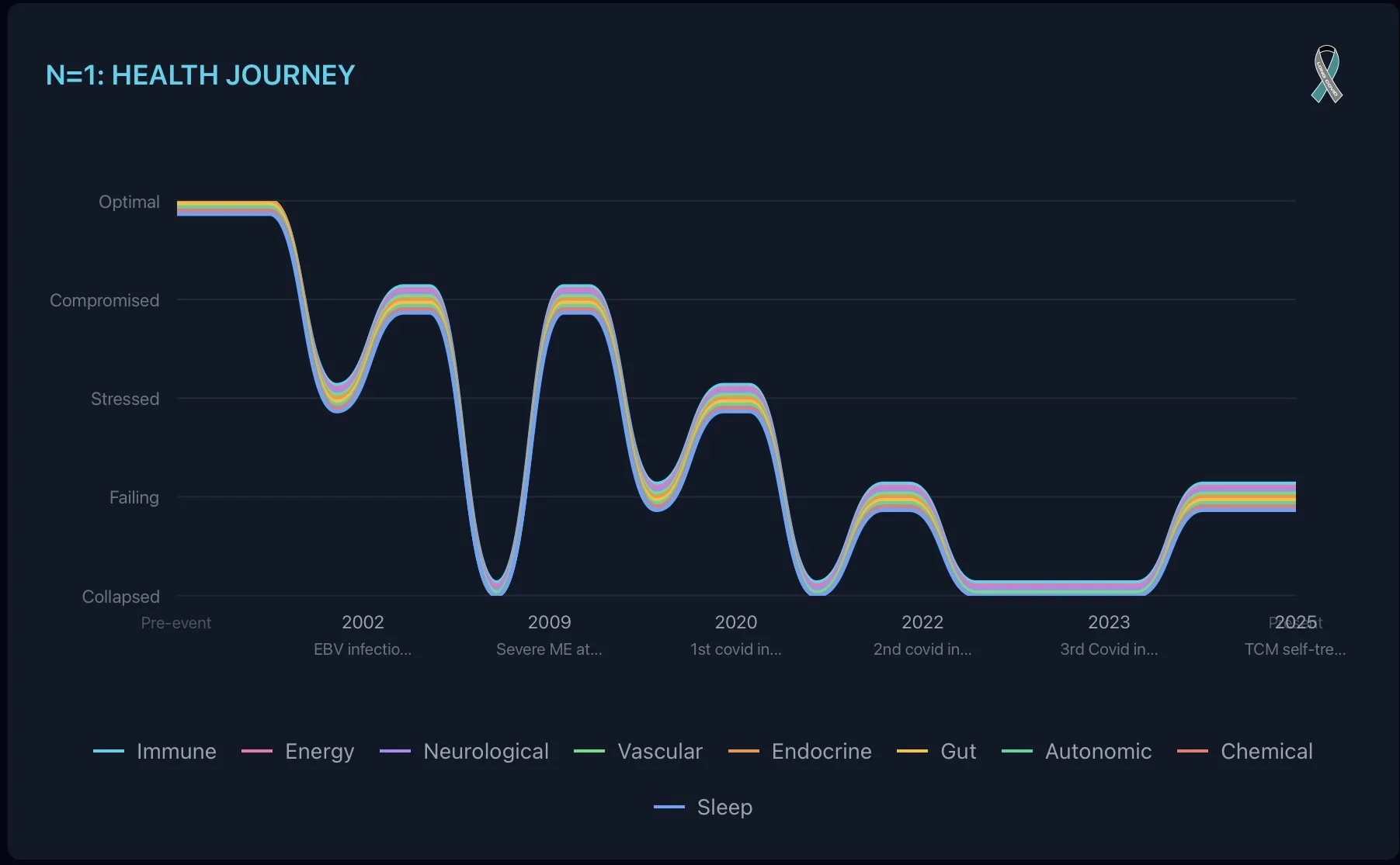 Complex health conditions affect multiple interconnected systems. Whilst tracking symptoms gives us a list, mapping the systems impacted visualises a pattern over-time.